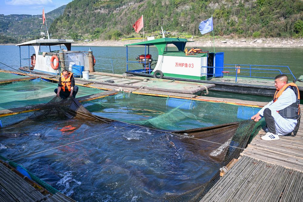 9일 충칭(重慶)시 완저우(萬州)구에 위치한 수산연구소인 다저우(大周)기지 직원이 가두리 안의 어류 생장 상태를 점검하고 있다.