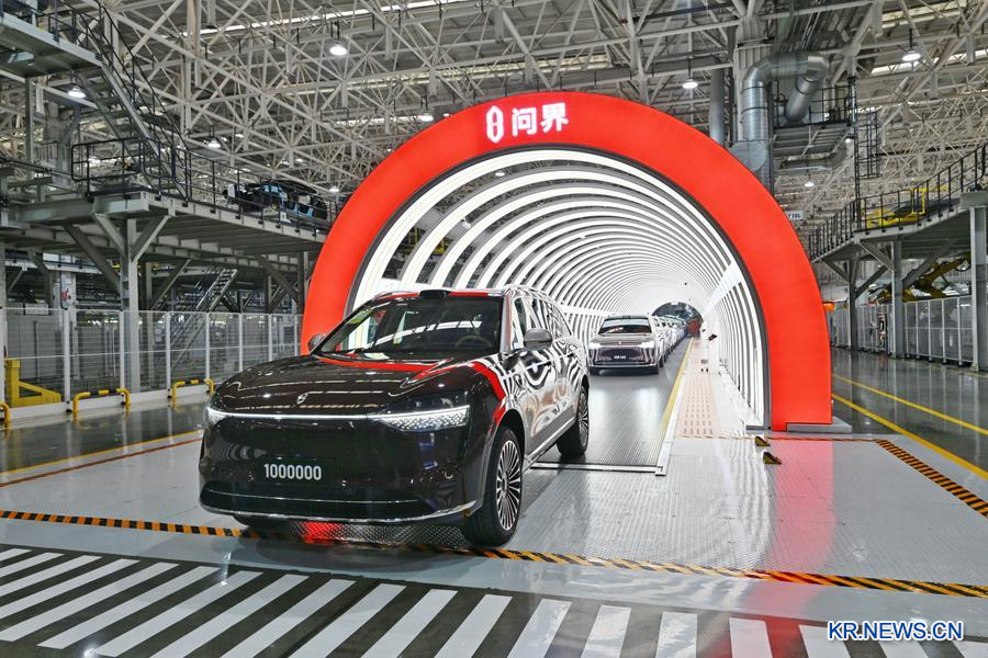 지난 1월 13일 충칭(重慶)시 량장(兩江)신구에 위치한 싸이리스(賽力斯·SERES) 슈퍼팩토리에서 100만 번째 원제(問界·AITO) 신에너지차가 출고되고 있다. (사진/신화통신)