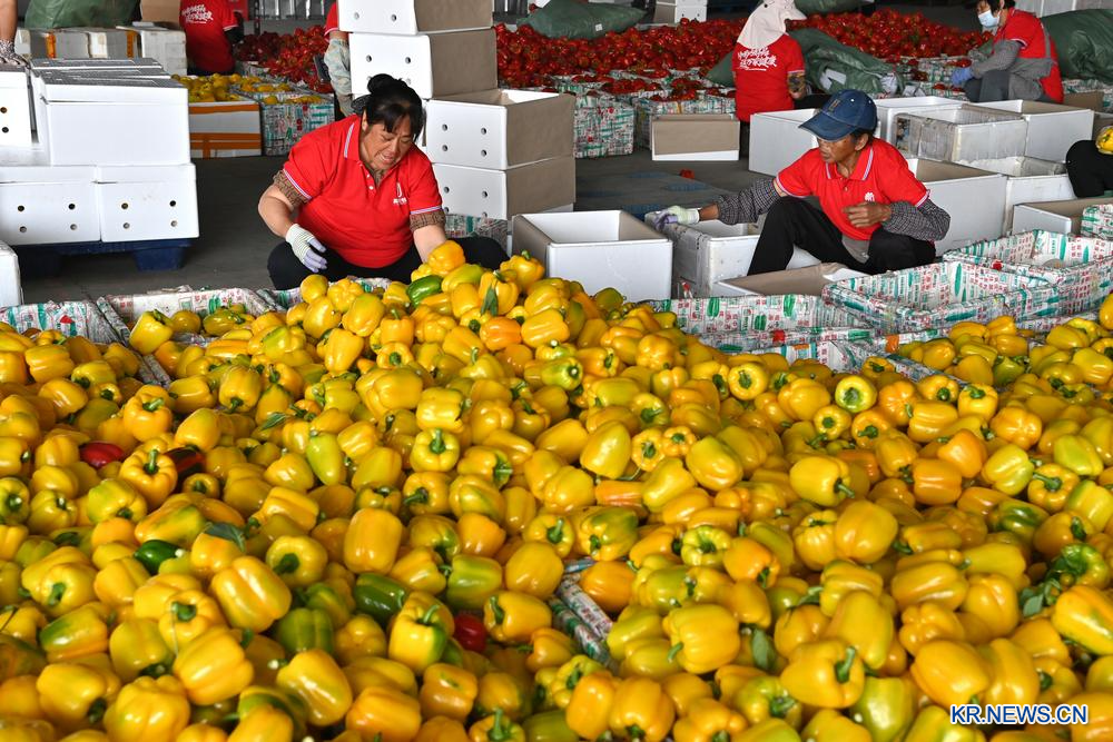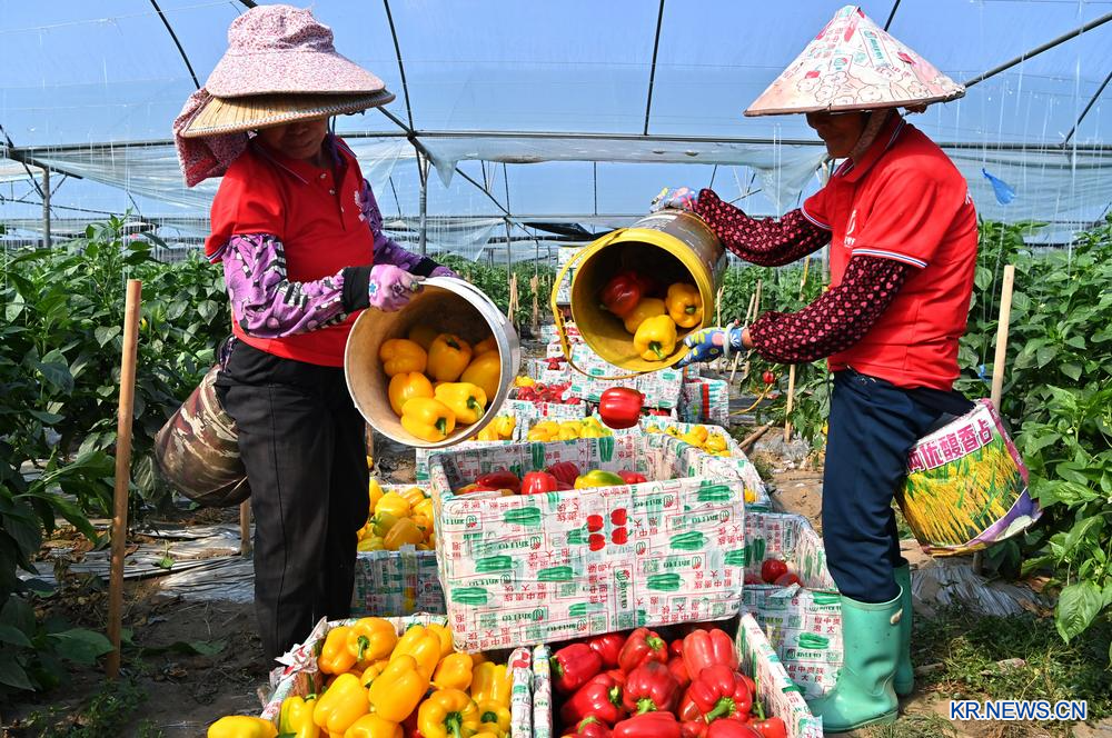 12일 직원이 광시(廣西)좡족자치구 허푸(合浦)현에 위치한 한 농업기술회사 시설 채소재배기지에서 갓 수확한 파프리카를 스티로폼 상자에 담고 있다.