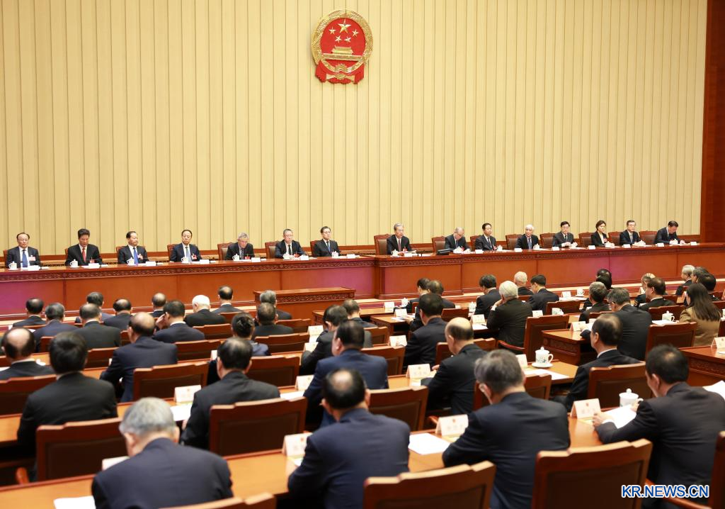 [신화망 베이징 3월13일] 제14기 전국인민대표대회(전인대) 제4차 회의 주석단이 12일 오전 베이징 인민대회당에서 제4차 회의를 열었다. 자오러지(趙樂際) 주석단 상무주석이 회의를 주재했다.[촬영/신화통신 기자 딩하이타오(丁海濤)]