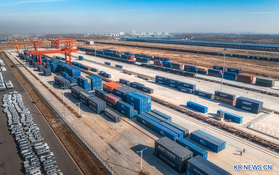 [신화망 베이징 3월18일] 중국-유럽 화물열차 선양(瀋陽)집결센터 화물기지에서 화물을 가득 실은 열차가 만저우리(滿洲里) 통상구를 통과한 뒤 유럽을 향해 달려갔다.