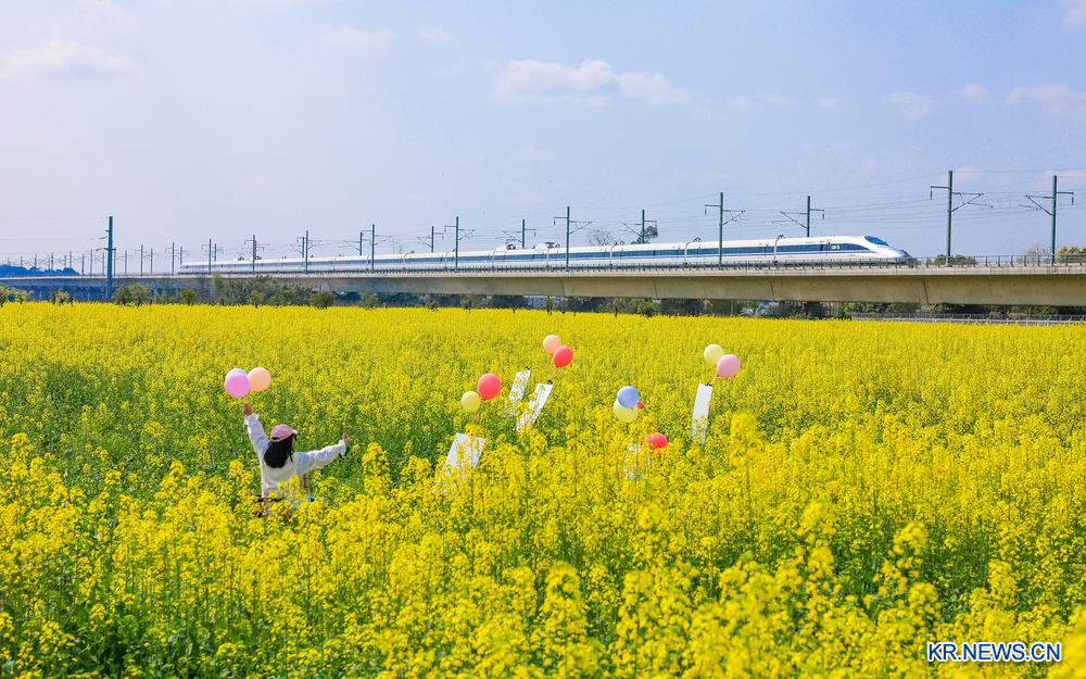 봄 기운 물씬...기차길 옆에 활짝 핀 유채꽃-Xinhua