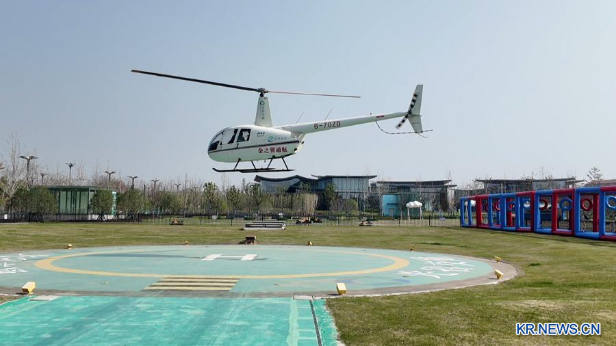 중국 광밸리 웨이라이후이(未來薈) 저고도 문화관광산업 시범단지에서 헬기 체험을 하는 관광객들. (사진/신화통신)