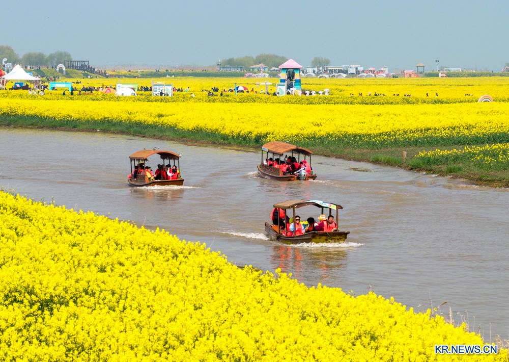 22일 장쑤(江蘇)성 가오유(高郵)시 후상화하이(湖上花海) 관광지에서 물놀이를 즐기고 있는 관광객들을 드론으로 촬영했다. 2026.3.22