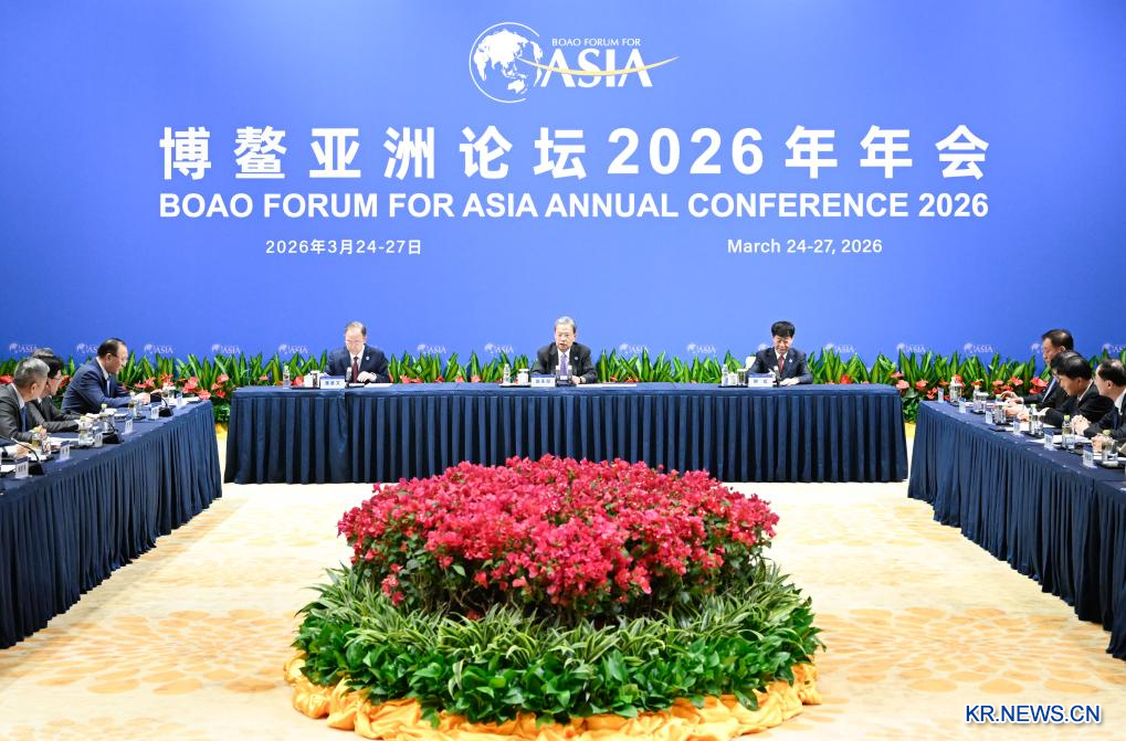 [신화망 중국 보아오 3월28일] 자오러지(趙樂際) 전국인민대표대회(전인대) 상무위원장이 26일 오후 하이난성 보아오에서 ‘2026보아오아시아포럼(BFA) 연차총회’에 참석한 국내외 기업인 대표들을 만나 좌담회를 진행했다.[촬영/신화통신 기자 선훙(申宏)]