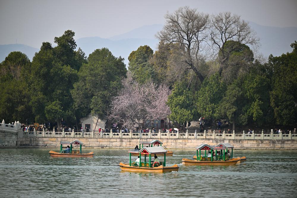 28일 이화원에서 배를 타며 풍경을 감상하는 사람들. 2026.3.28