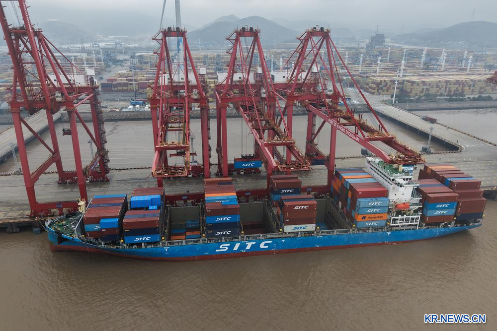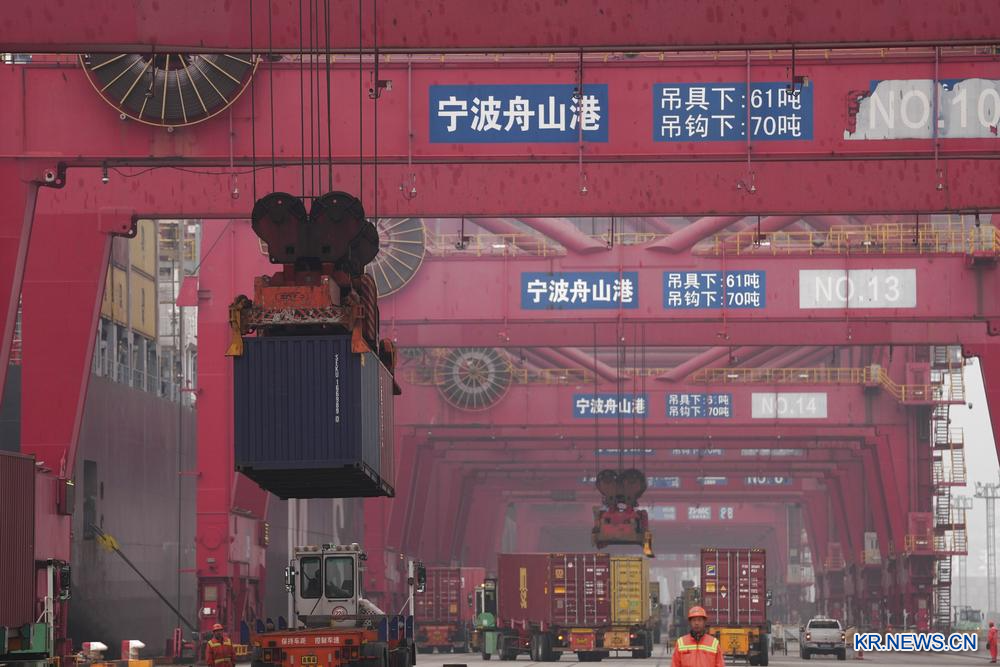 29일 저장(浙江)성 닝보(寧波)∙저우산(舟山)항 촨산(穿山)항구 컨테이너부두에서 컨테이너 하역 작업이 진행되고 있다.