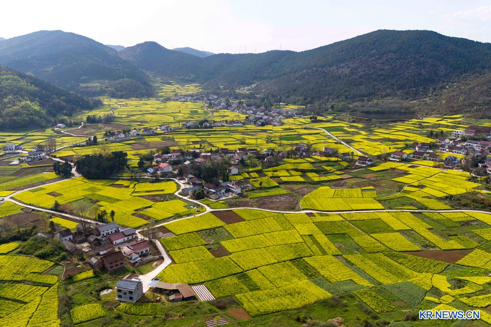 28일 한중시 난정(南鄭)구 천(陳)촌에서 드론으로 내려다본 유채꽃밭. 2026.3.29