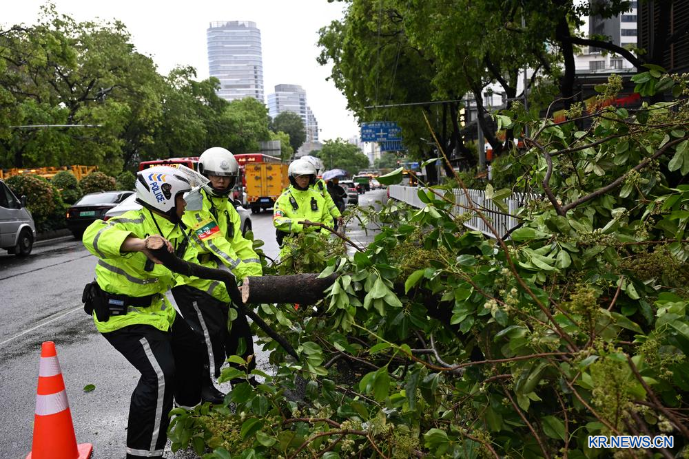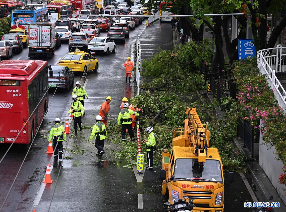 30일 광둥(廣東)성 광저우(廣州)시에서 쓰러진 가로수를 정리하는 교통경찰.
