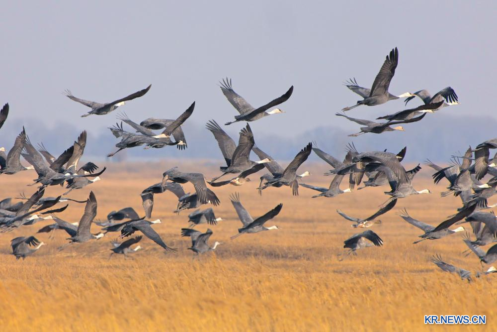 지난달 31일 헤이룽장성 치치하얼(齊齊哈爾)시 커친후(克欽湖)습지 상공에서 날갯짓하는 흑두루미떼. 2026.4.1