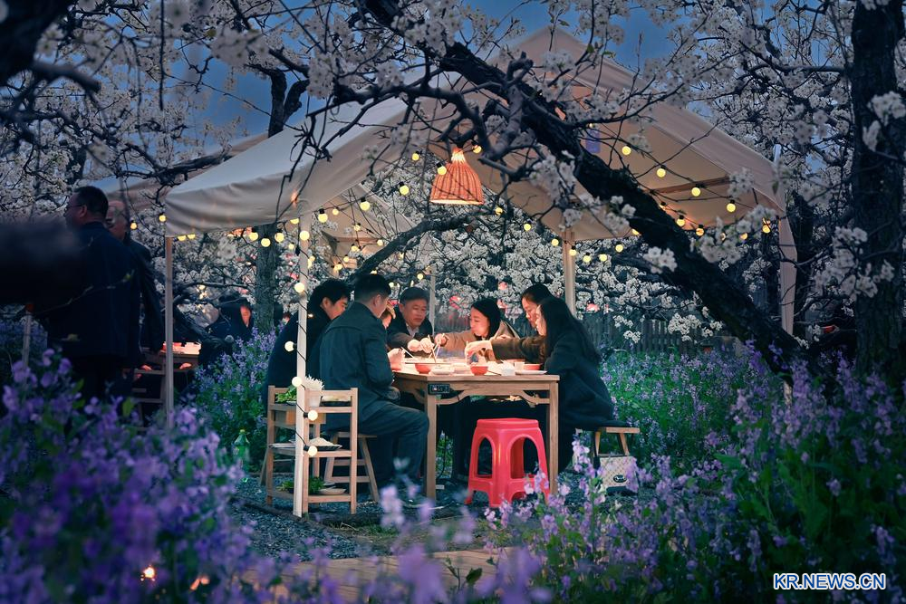 [신화망 중국 당산 4월4일]지난달 31일 여행객들이 안후이(安徽)성 쑤저우(宿州)시 당산(碭山)현에 있는 한 배밭에서 음식을 즐기고 있다.