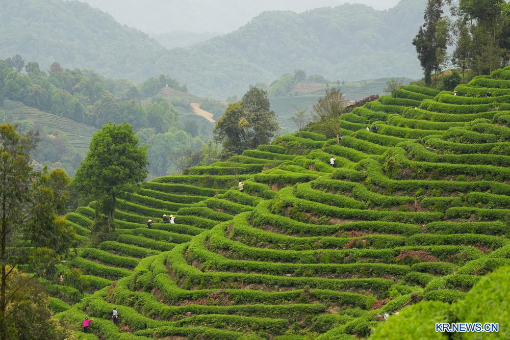 [신화망 베이징 4월6일] 사람들이 5일 쓰촨(四川)성 야안(雅安)시 뉴녠핑(牛碾坪) 차밭 관광지에서 찻잎 따기를 체험하고 있다.