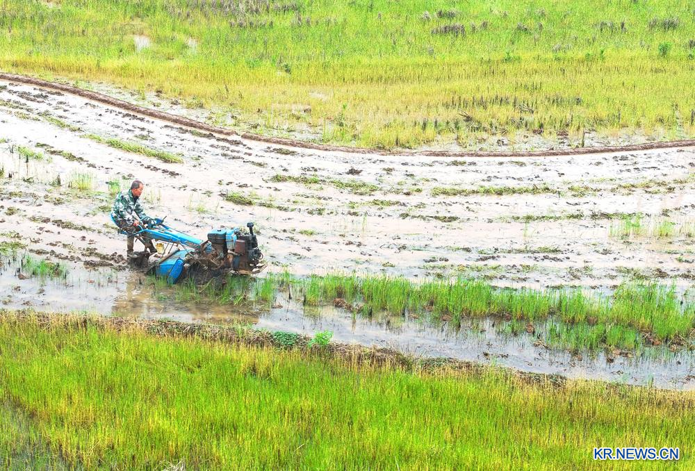 [신화망 베이징 4월 8일] 7일 후난(湖南)성 헝양(衡陽)시 헝둥(衡東)현에서 농기계로 논갈이를 하는 농민을 드론에 담았다.