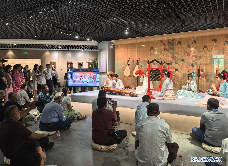 상하이협력기구(SCO) 미디어 싱크탱크 정상회의에 참석한 귀빈들이 지난해 7월 26일 중국(허난)자유무역구 국제예술품보세창고에서 민족 악기 재현 전시∙공연을 관람하고 있다. (사진/신화통신)