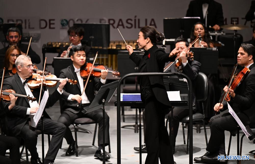 징환(景煥·가운데) 중국교향악단 상임지휘자가 7일 브라질 수도 브라질리아에서 열린 '중국·브라질 문화의 해' 특별 음악회에서 지휘하고 있다. 2026.4.8