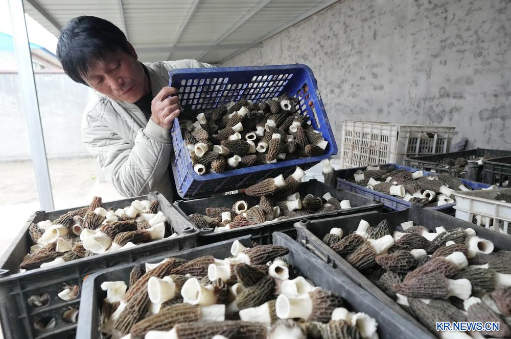 9일 허베이(河北)성 첸안(遷安)시 상서옌좡(上射雁庄)진 농민이 곰보버섯을 정리·선별하고 있다.