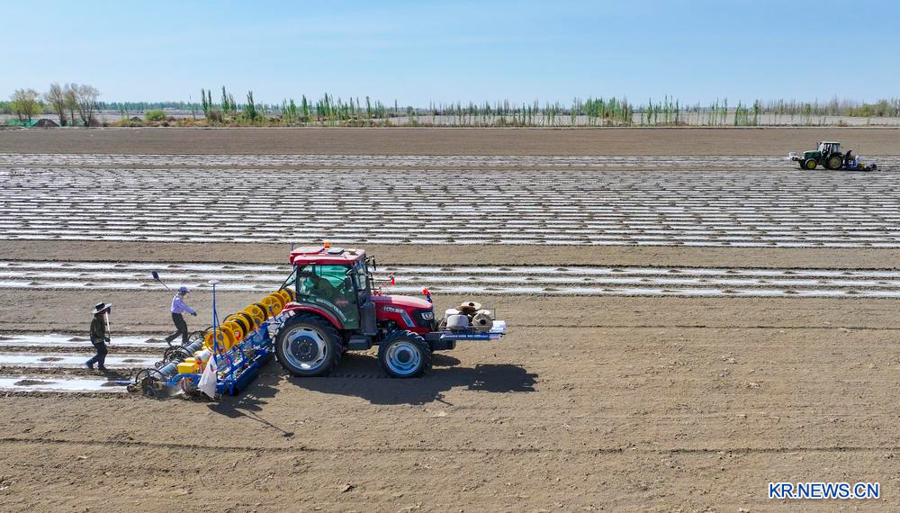 [신화망 중국 우루무치 4월 13일] 최근 신장(新疆)위구르자치구 위리(尉犁)현 면화밭에선 파종 작업이 한창이다. 올해 위리현은 다양한 파종 기술을 도입해 6만6천700헥타르(ha) 규모의 면화를 재배할 계획이다.