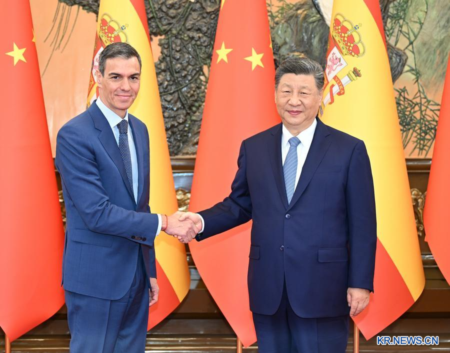 [신화망 베이징 4월14일] 시진핑(習近平) 중국 국가주석이 14일 오전 베이징 인민대회당에서 중국을 공식 방문한 페드로 산체스 스페인 총리와 회견했다.