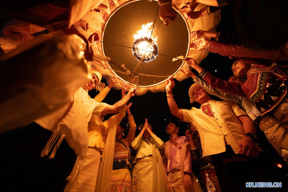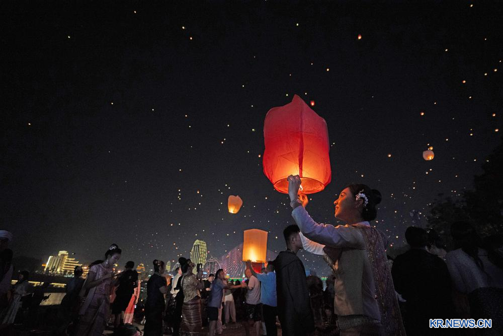 [신화망 중국 징훙 4월14일] 13일 저녁, 관광객과 현지 주민들이 윈난(雲南)성 시솽반나(西雙版納) 다이(傣)족자치주 징훙(景洪)시 란창(瀾滄)강 강변에서 함께 축복을 담은 공명등(孔明燈)을 날렸다. 하늘로 솟은 등불은 강물의 물결과 어우러져 장관을 이뤘다.
