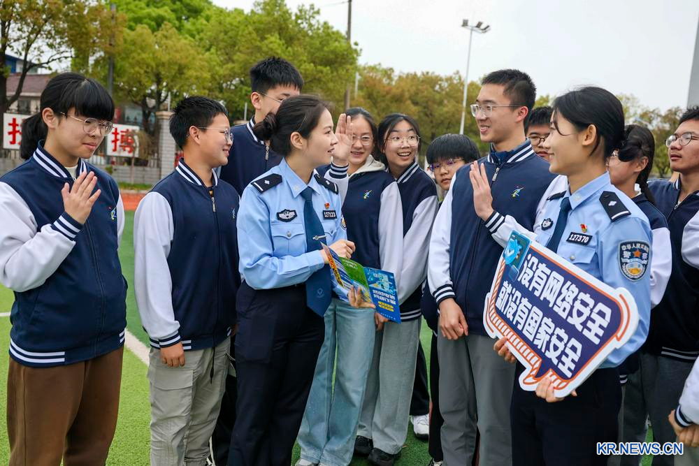 장쑤(江蘇)성 타이싱(泰興)시 인민감찰원 관계자가 13일 타이싱시의 한 학교 운동장에서 학생들에게 국가 안전 지식에 대해 설명하고 있다.