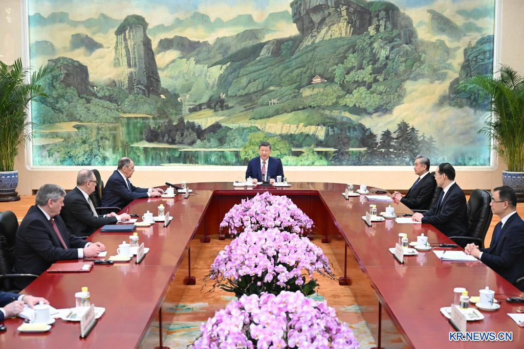 시진핑(習近平) 중국 국가주석이 15일 오전 베이징 인민대회당에서 세르게이 라브로프 러시아 외무장관과 회견했다.[촬영/신화통신 기자 옌옌(燕雁)]