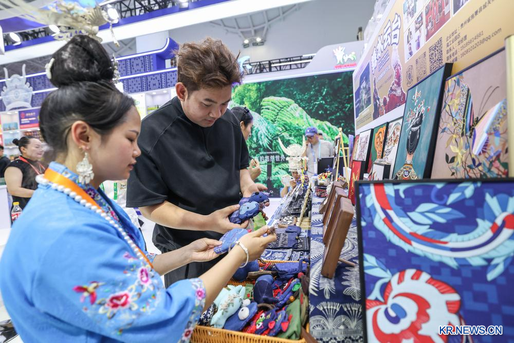 14일 '제6회 중국국제소비재박람회(CICPE)'를 찾은 관람객들이 먀오(苗)족 자수 제품을 둘러보고 있다.