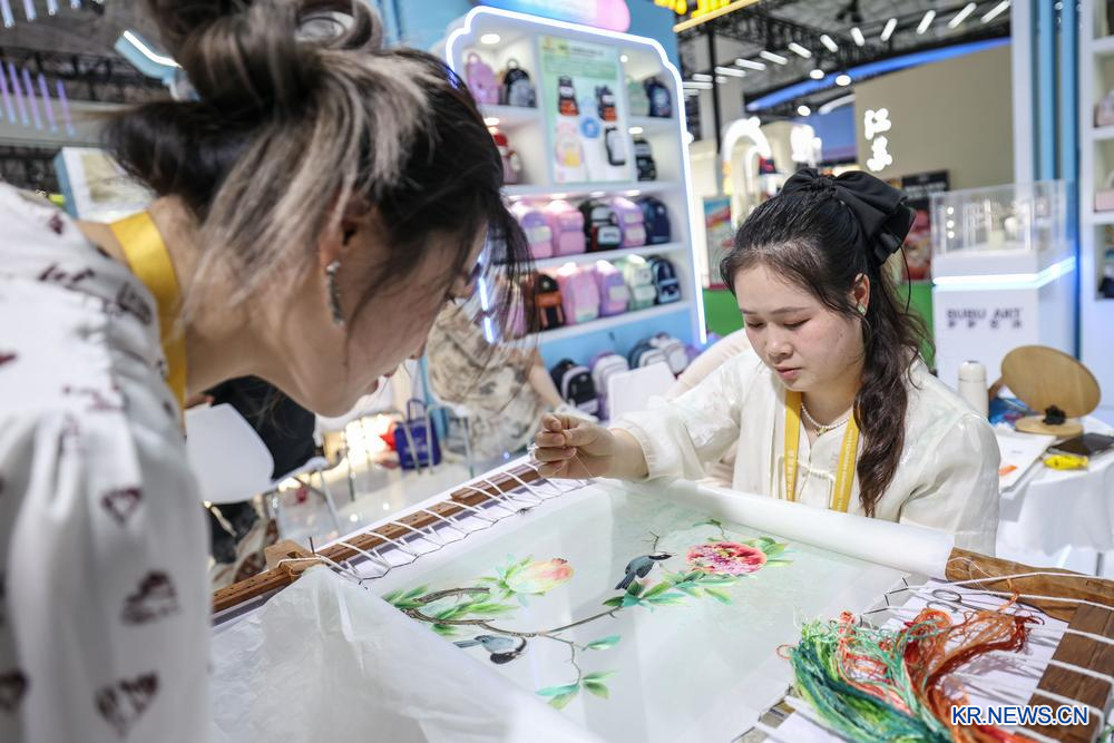 14일 관람객이 '제6회 CICPE'에서 한 참가업체 직원이 상수(湘繡·후난 전통 자수)를 수놓는 모습을 살펴보고 있다. 2026.4.15