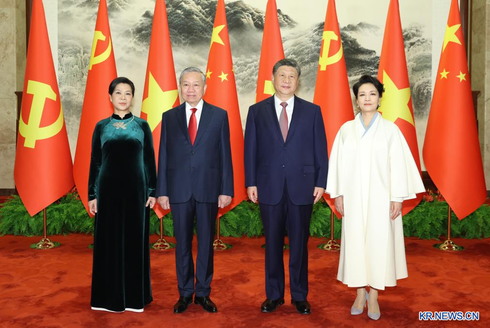 시 주석이 15일 오전 베이징 인민대회당에서 중국을 국빈 방문한 또 럼 서기장과 회담했다. 회담에 앞서 시 주석과 부인 펑리위안(彭麗媛) 여사가 또 럼 서기장 부부와 기념사진을 찍고 있다.[촬영/신화통신 기자 황징원(黃敬文)]