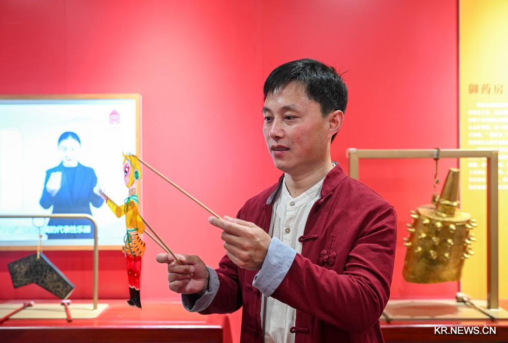 링위안(淩源)그림자극 시(市)급 전승자인 장애인 장쭤페이(張佐飛)가 16일 자신의 그림자극 작품을 선보이고 있다.