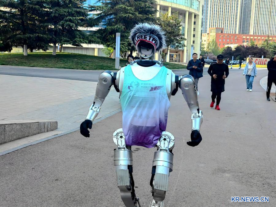 산둥(山東)성 지난(濟南) 하이테크산업개발구 치루(齊魯)소프트웨어파크에서 휴머노이드 로봇 '싱저타이산(行者泰山)'이 특별 훈련을 받고 있다. 산둥유바오터(優寶特)스마트로봇회사가 개발한 이 로봇은 '2025 세계 휴머노이드 로봇 스포츠 대회' 100m 시범 경기에서 1위를 차지한 적이 있다.