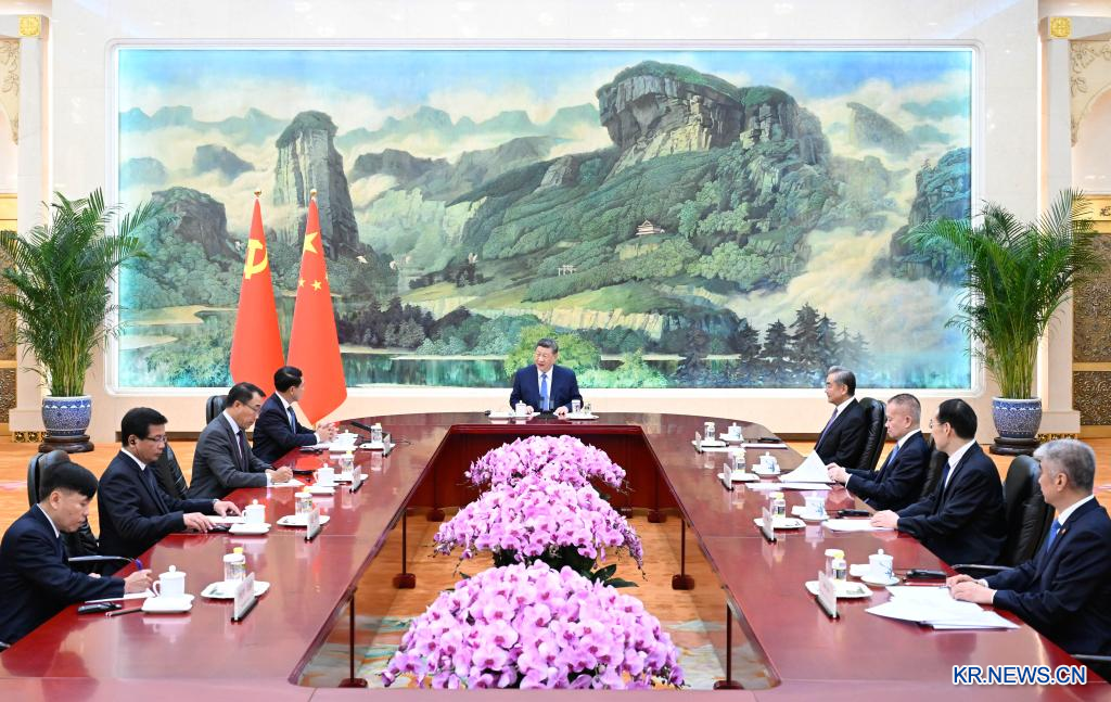 시진핑(習近平) 중국 공산당 중앙위원회 총서기, 국가주석이 21일 오후 베이징 인민대회당에서 통룬 시술리트 라오스 인민혁명당 중앙위원회 서기장 겸 국가주석의 특사 자격으로 중국을 방문한 살름싸이 꼼마싯 라오스 인민혁명당 중앙정치국 위원 겸 상무 부총리를 회견했다.[촬영/신화통신 기자 선훙(申宏)]