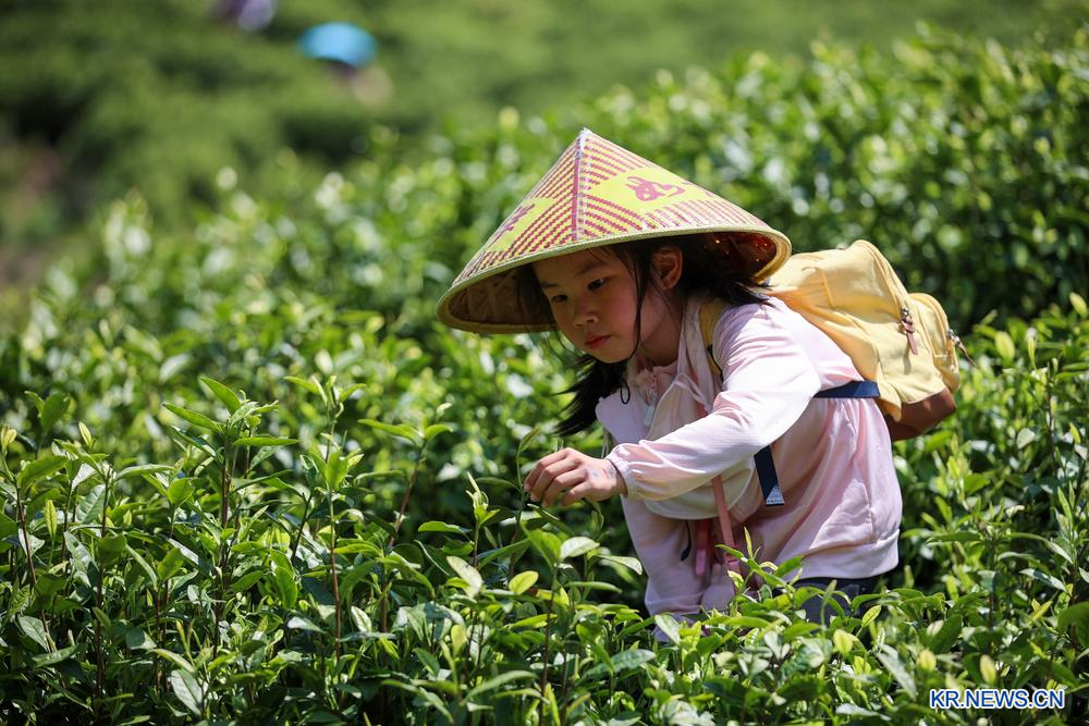 지난 19일 저장(浙江)성 후저우(湖州)시 우싱(吳興)구 먀오시(妙西)진에서 한 어린이가 찻잎 따기 체험을 하고 있다.