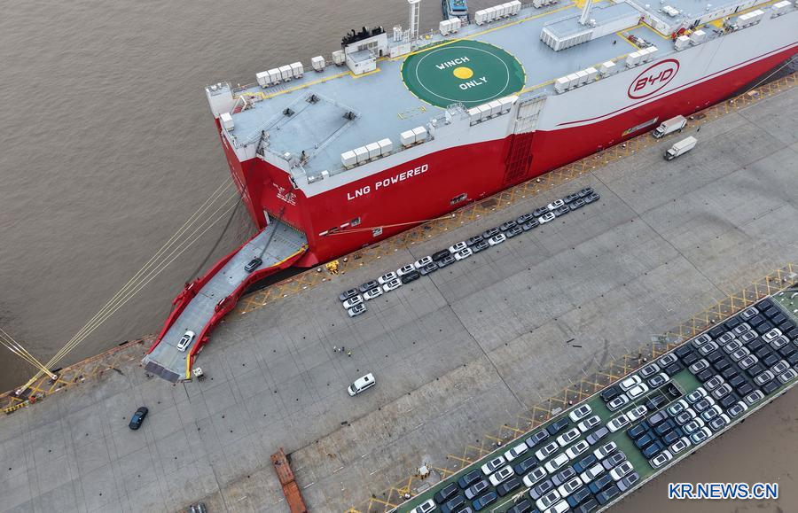 상하이 와이가오차오(外高橋)의 하이퉁(海通) 자동차 로로부두. 신에너지차들이 하나둘씩 비야디(BYD)의 '창사(長沙)호'에 진입하고 있다. 지난해 진수된 '창사호'는 세계 최대 규모의 자동차 로로선 중 하나로 6천여 대의 신차를 싣고 이탈리아, 스페인 등 지역으로 향할 예정이다.