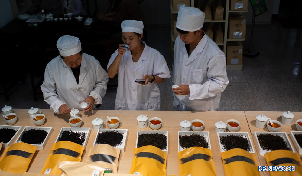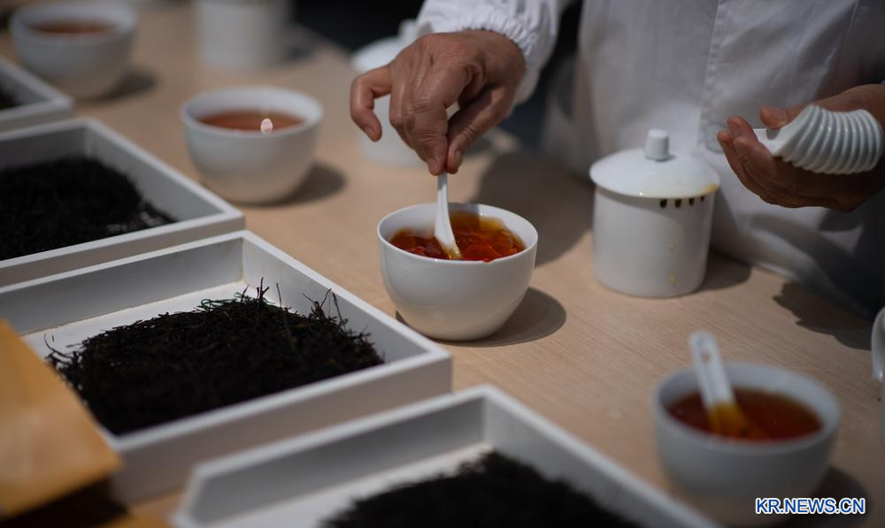22일 윈난(雲南)성 린창(臨滄)시 솽장(雙江)현의 찻잎 검사·감별·추천·추적센터 전문가들이 차를 우려 찻잎의 상태를 평가하고 있다.