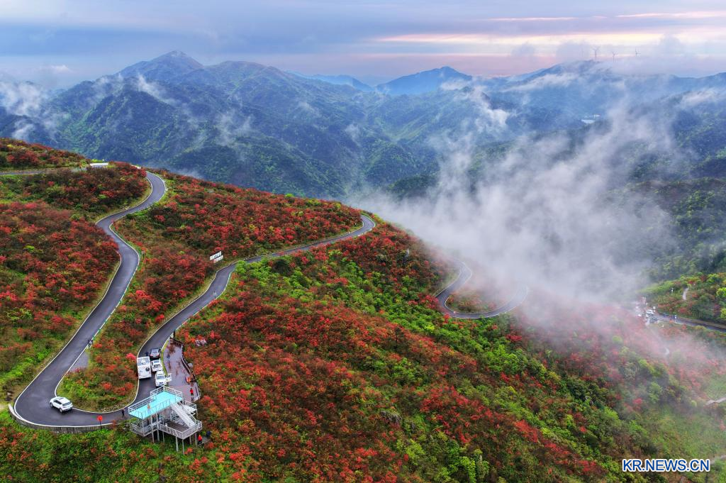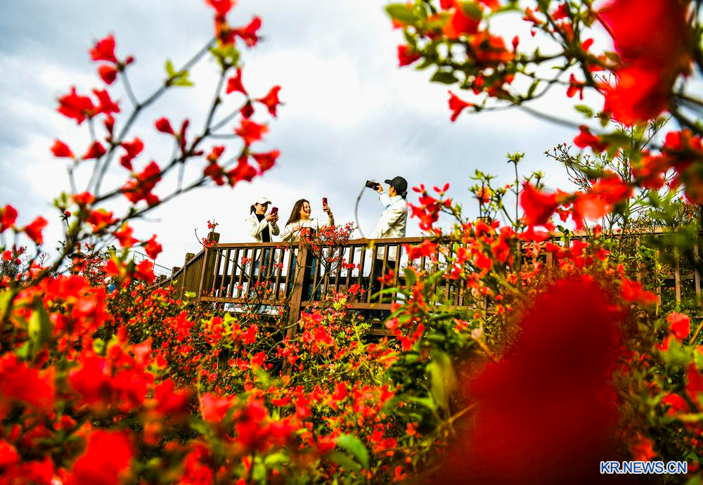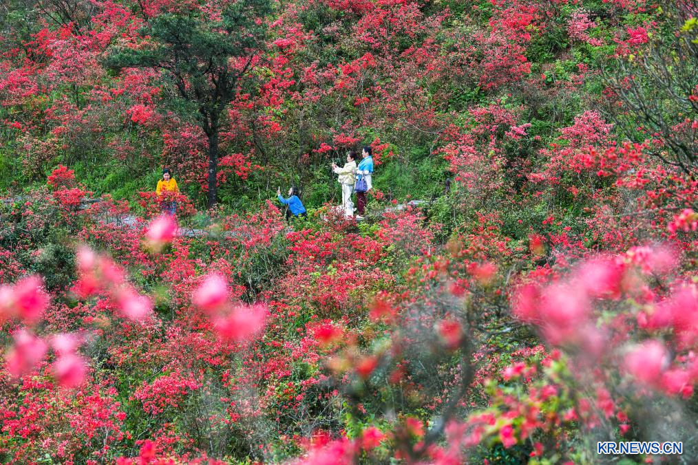 23일 관광객들이 후난(湖南)성 융저우(永州)시 양밍산(陽明山)국가삼림공원에서 진달래꽃을 감상하고 있다.