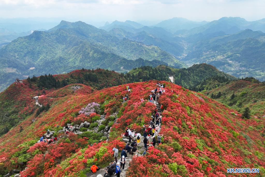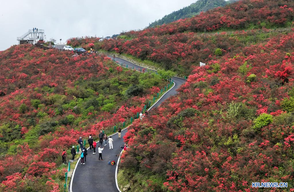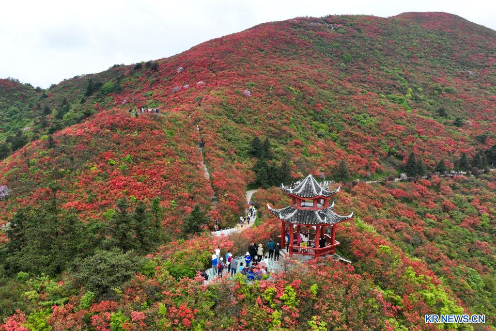 23일 구이저우성 단자이(丹寨)현 룽취안산(龍泉山)에서 진래래꽃을 감상하고 있는 관광객을 드론으로 내려다봤다.