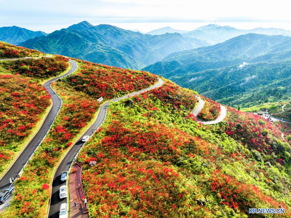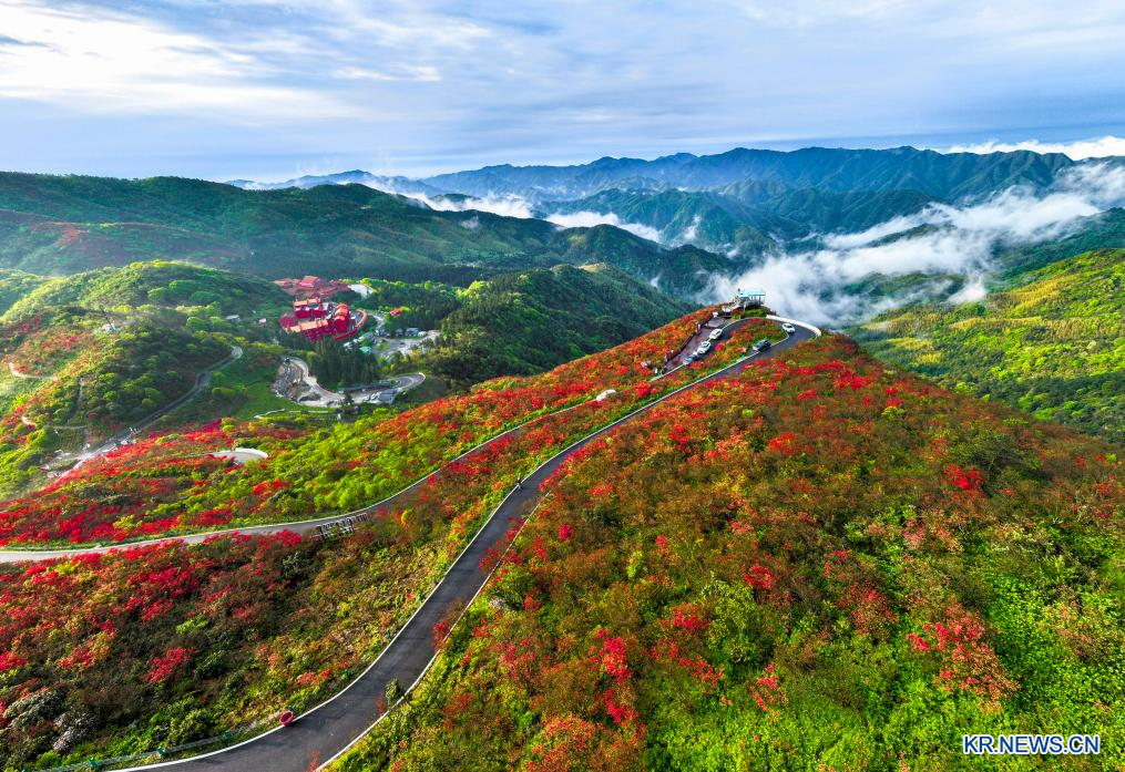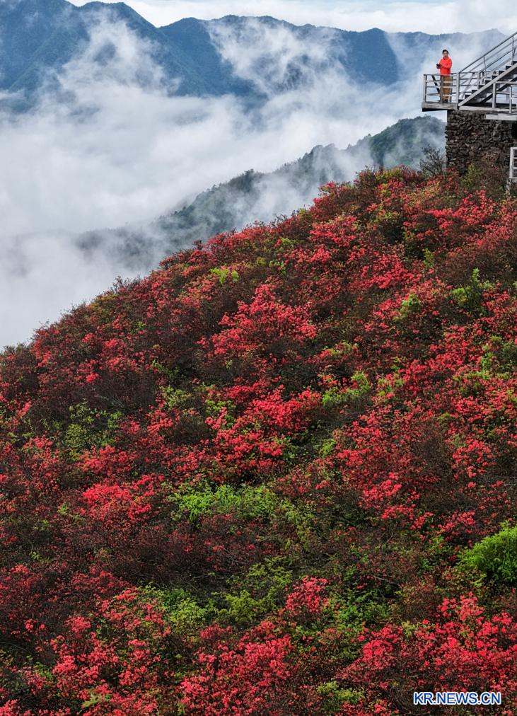 [신화망 베이징 4월25일] 중국 여러 지역에서 야생 진달래가 만개했다. 붉은 노을처럼 화려한 진달래가 상춘객들의 발길을 사로잡고 있다.