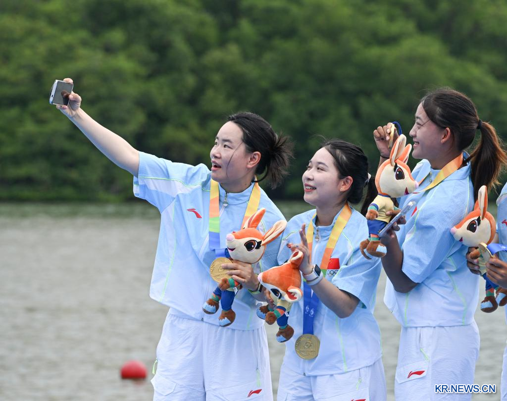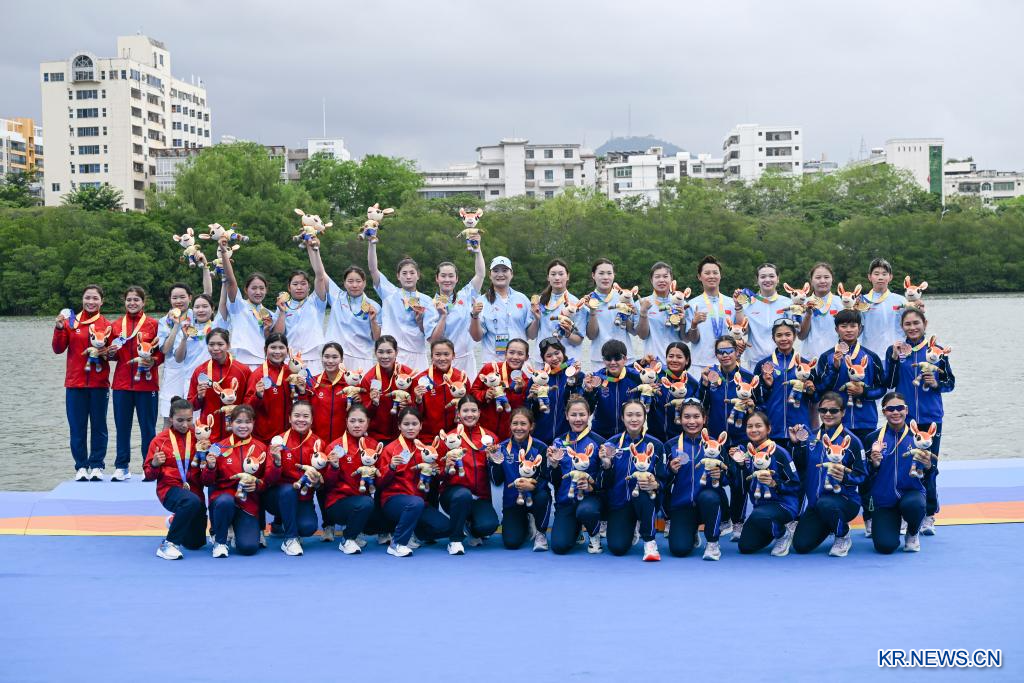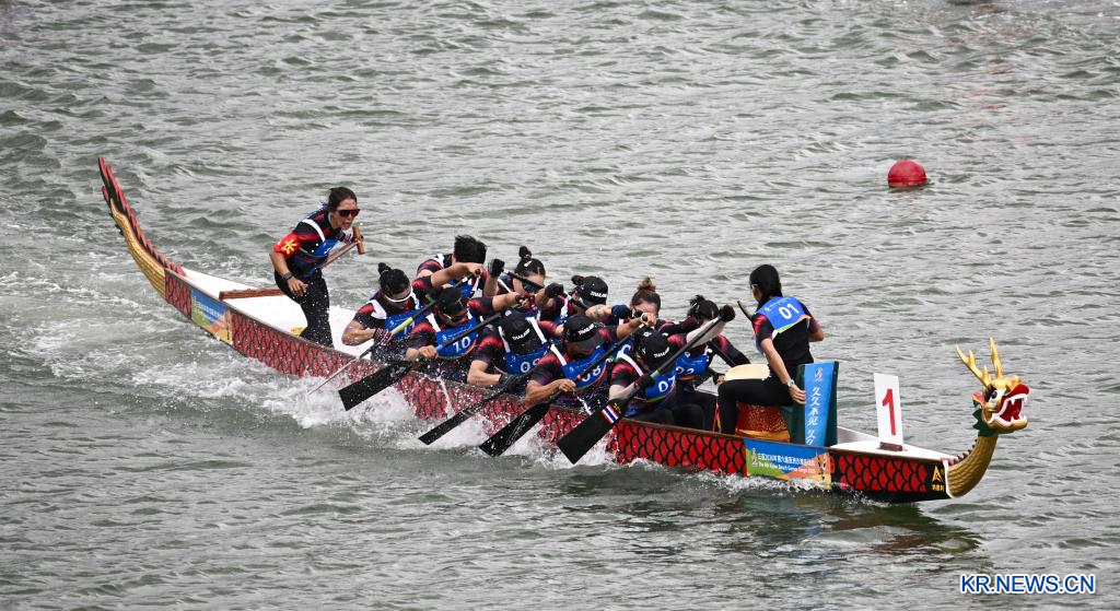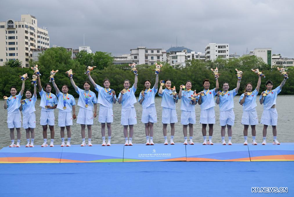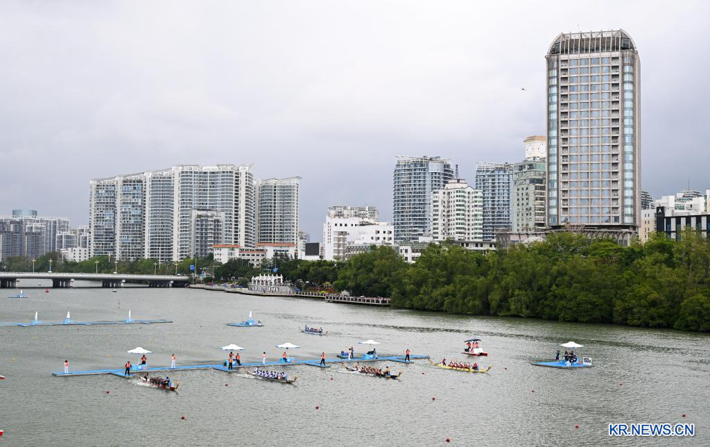 24일 중국 하이난(海南)성 싼야(三亞)에서 열린 제6회 아시안 비치 게임(ABG) 드래곤보트(용선) 종목 여자부 12인승 드래곤보트 100m 직선경기 결승에서 중국팀이 우승을 차지했다. 은메달은 베트남팀이, 동메달은 태국팀이 가져갔다.[촬영/신화통신 기자 양관위(楊冠宇)]