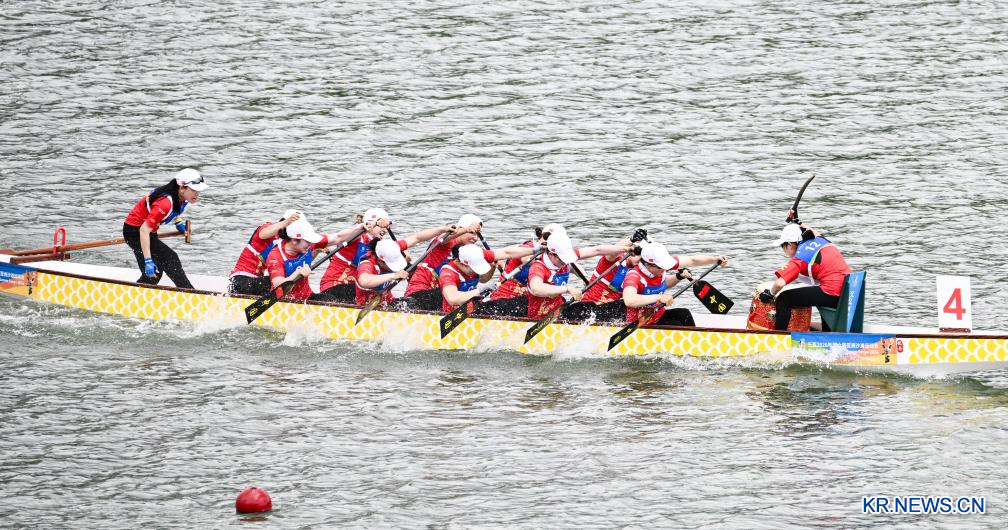 [신화망 싼야 4월25일] 24일 중국 하이난(海南)성 싼야(三亞)에서 열린 제6회 아시안 비치 게임(ABG) 드래곤보트(용선) 종목 여자부 12인승 드래곤보트 100m 직선경기 결승에서 중국팀이 우승을 차지했다. 은메달은 베트남팀이, 동메달은 태국팀이 가져갔다.[촬영/신화통신 기자 양관위(楊冠宇)]