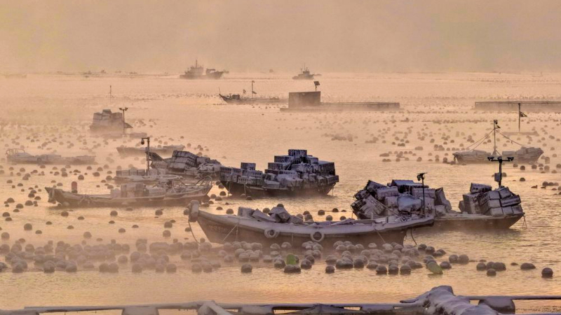 中 산둥성 아이룬완, 겨울 바다 물안개 장관