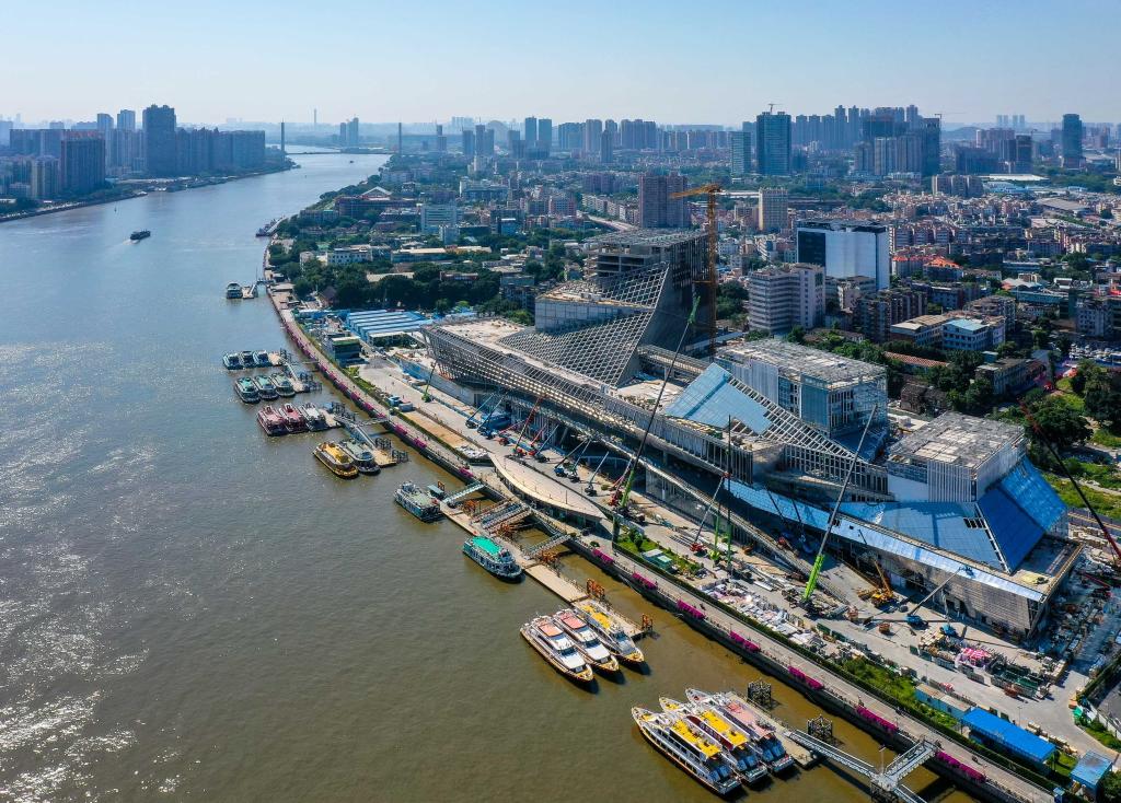 광둥미술관, 광둥무형문화유산전시센터, 광둥문학관 등을 하나로 합친 길이 350m, 높이 약80m의 건물은 마치 거대한 배가 주강(珠江)에 돛을 펼친 듯한 모습을 연상케 한다.(10월12일 촬영, 드론 파노라마 사진)