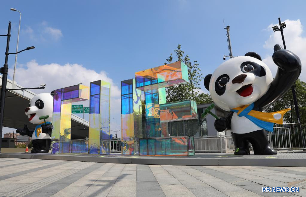 [신화망 상하이 10월16일] 상하이 칭푸(青浦)구에 위치한 국가컨벤션센터(상하이)가 11월 5일 개최 예정인 '제5회 중국 국제수입박람회(CIIE)'를 준비하기 위해 외부 인테리어 작업을 진행 중이다. 15일 국가컨벤션센터(상하이) 북문 바깥쪽에 CIIE와 판다 조형물이 세워져 있다. 2022.10.15