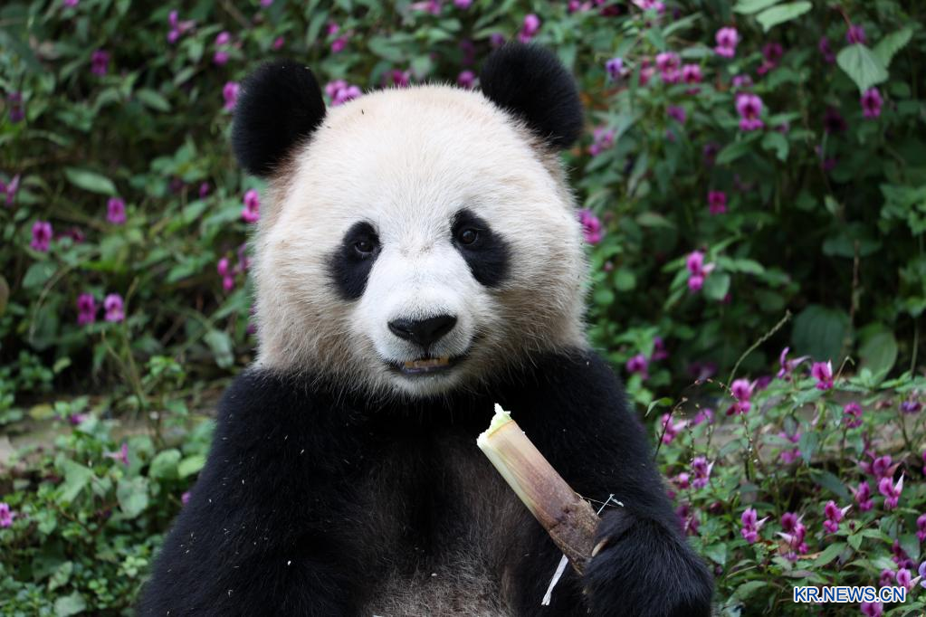 [신화망 청두 10월19일] 지난 17일 중국 쓰촨(四川)성 자이언트판다 보호연구센터 야안(雅安)기지에서 자이언트판다 '쓰하이(四海)'가 대나무를 먹고 있는 모습. 18일 자이언트판다 '쓰하이'와 '징징(京京)'은 카타르로 향하기 위해 야안기지를 떠났다. 이는 중국과 중동지역이 진행하는 첫 번째 자이언트판다 협력 사례다. 2022.10.18