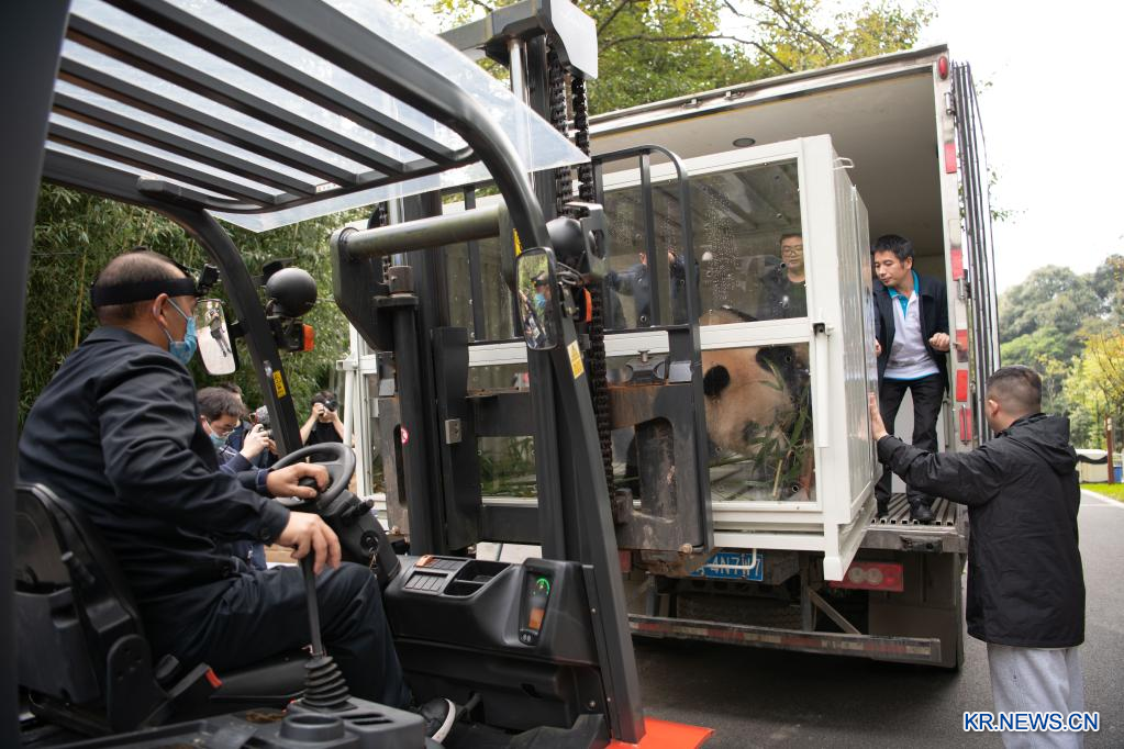 18일 자이언트 판다 '쓰하이(四海)'와 '징징(京京)'은 중국 쓰촨(四川)성에 위치한 자이언트판다 보호연구센터 야안(雅安)기지를 떠나 전용기를 타고 카타르로 향했다. 당일 야안기지에서 직원이 '징징'을 차로 이송하고 있다. 이는 중국과 중동지역이 진행하는 첫 번째 자이언트판다 협력 사례다. 2022.10.18