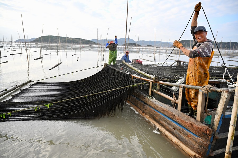 21일 샤푸현의 어민들이 김을 수확하고 있다. (사진/신화통신)
