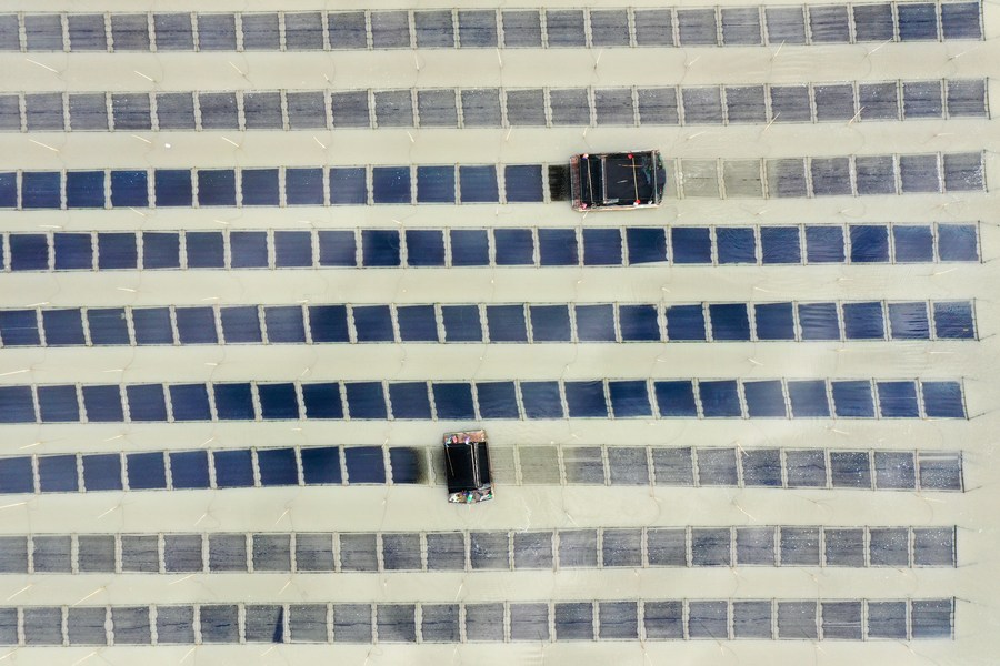 샤푸현 어민들이 김을 수확하고 있는 모습을 21일 드론으로 촬영했다. (사진/신화통신)