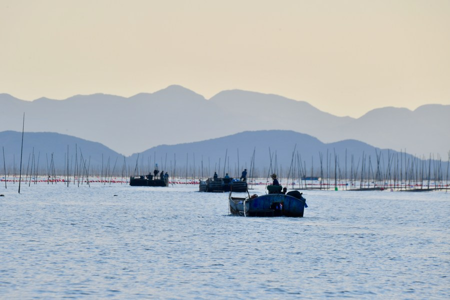 배에 탄 샤푸현 어민들이 21일 해상 김 양식장으로 접근하고 있다. (사진/신화통신)