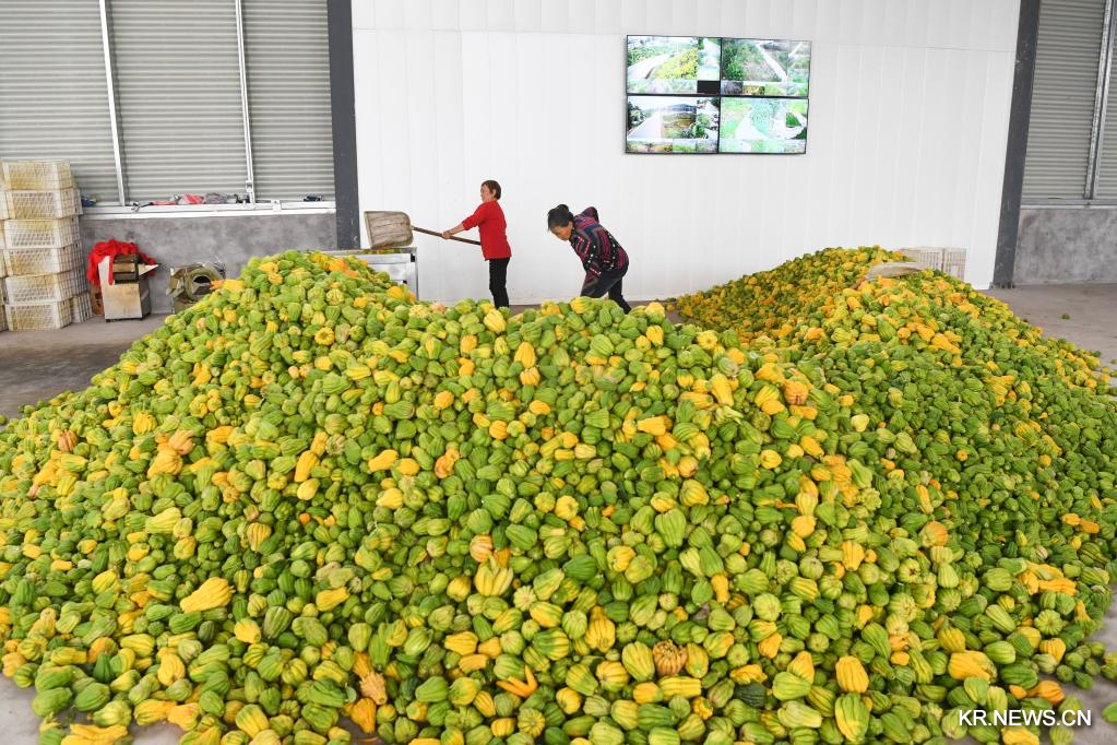 [신화망 다주 10월29일] 최근 수년간 충칭(重慶)시 다주(大足)구는 ▷선두기업 유치 ▷인프라 완비 ▷'회사+마을단체+농가' 시스템 도입 등 조치를 통해 중약재 산업을 발전시켰다. 27일 수확한 불수를 정리하고 있는 주민들. 2022.10.28