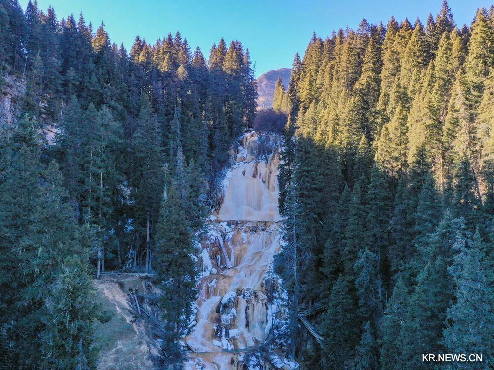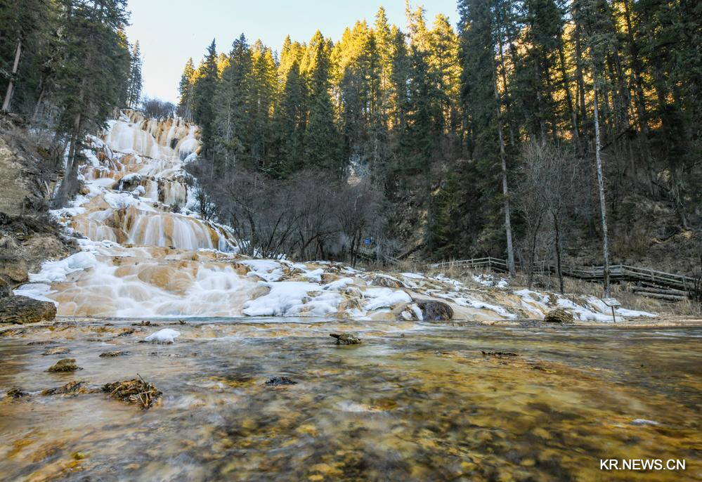 쓰촨(四川)성 쑹판(松潘)현에 위치한 머우니거우(牟尼溝) 풍경구에서 자가(扎嘎)폭포가 얼음 사이로 힘차게 흐르며 아름다운 겨울 풍경을 연출하고 있다.
