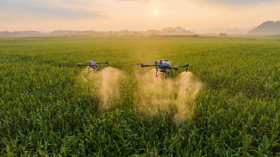 민간용 드론 기업 DJI(大疆·다장)의 농업 드론 T60(오른쪽)과 T25P가 밭에서 살포 작업을 하고 있다. (자료사진/신화통신)